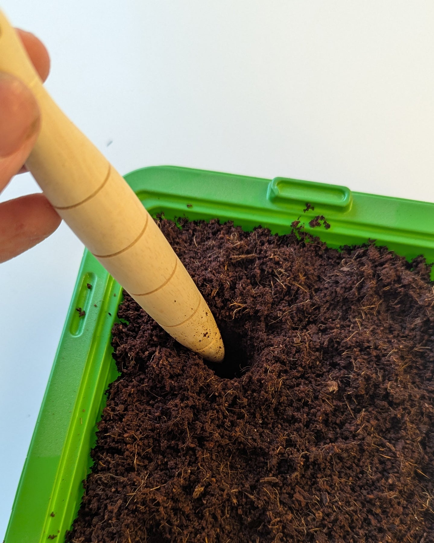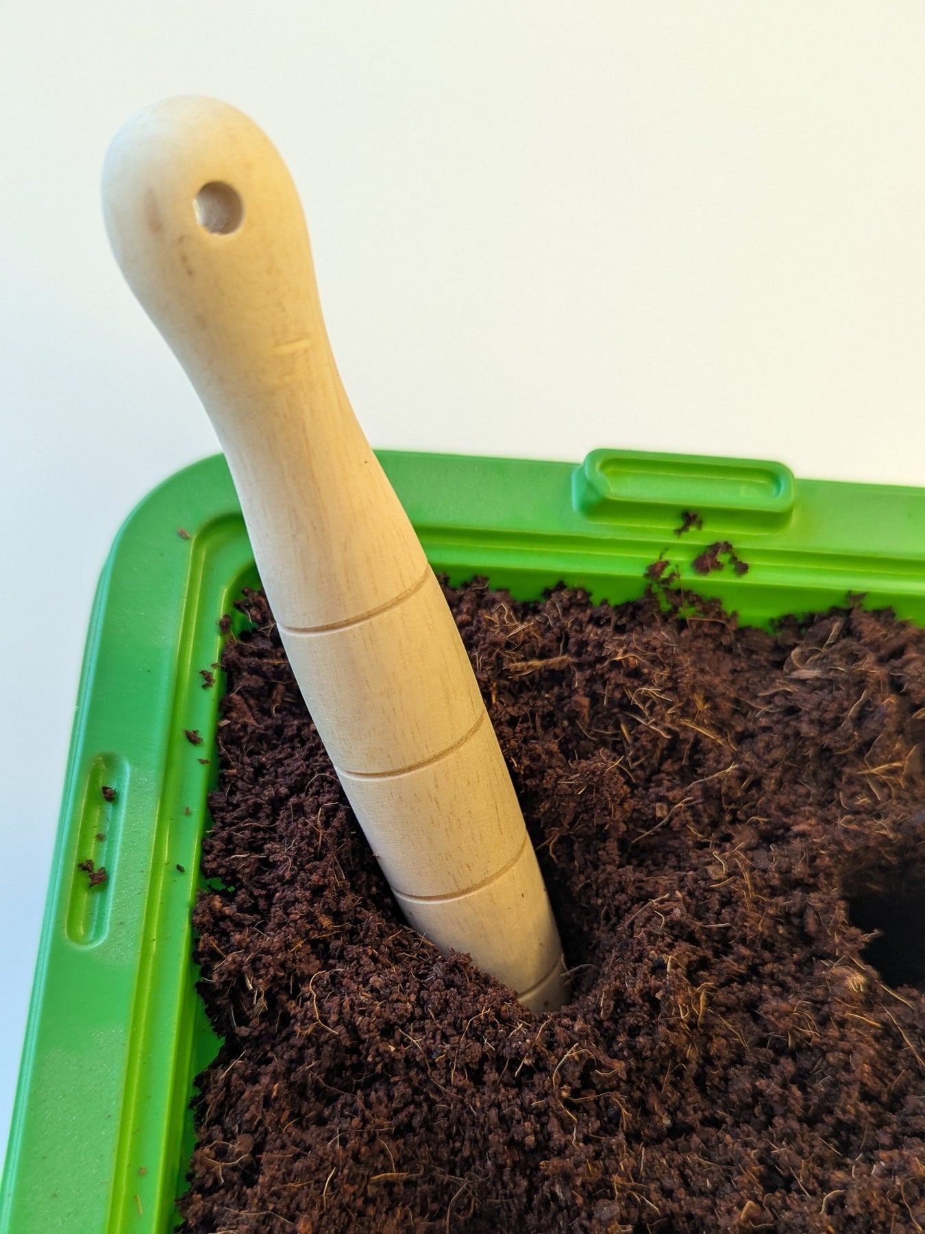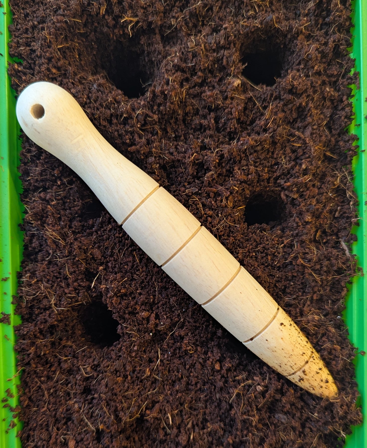 Kätevä puinen istutuspuikko, jolla on helppo tehdä niin siemenille kuin taimille valmiit reiät istutusta varten.