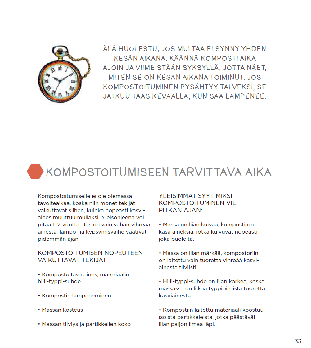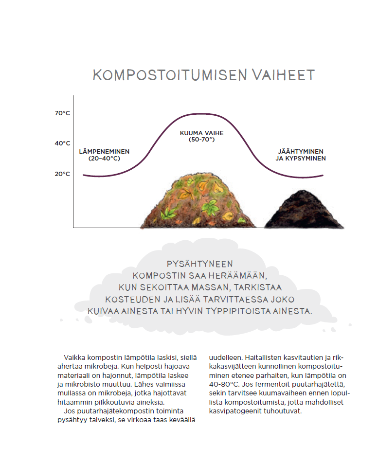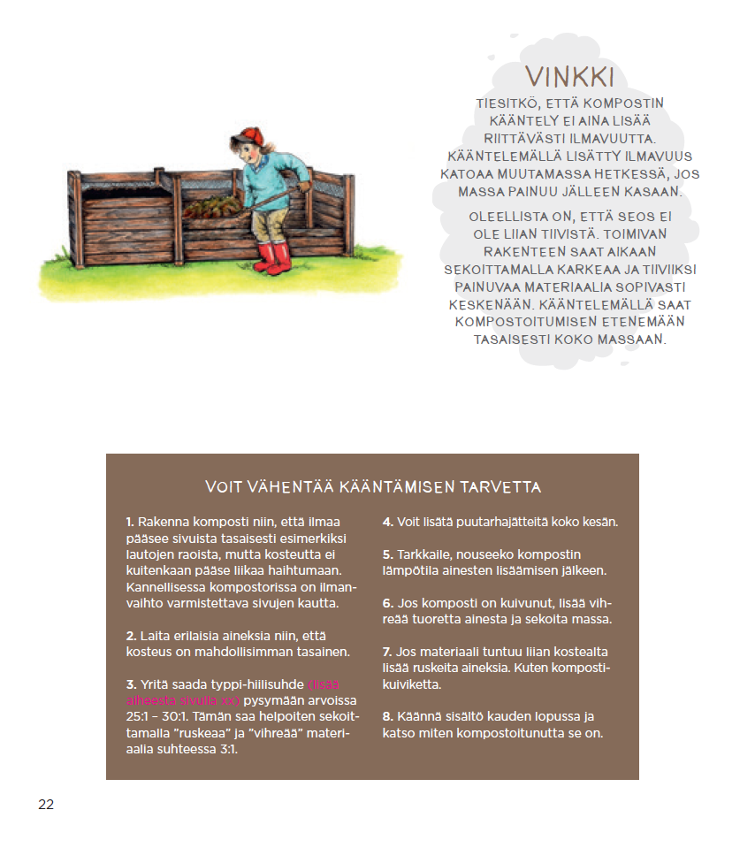 Oppaasta saat tietoja kompostimassan koostumuksesta ja miten kompostoitumista voi edistää. Vinkit auttavat ongelmatilanteissa ja kompostin toiminnan kohentamisessa.